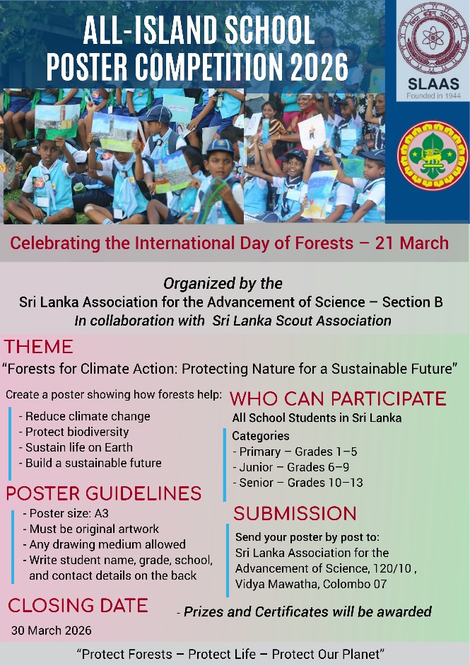 Section B – Agriculture and Forestry of the Sri Lanka Association for the Advancement of Science (SLAAS), in collaboration with the Sri Lanka Scout Association, invites school students across Sri Lanka to participate in a Poster Competition to celebrate the International Day of Forests.