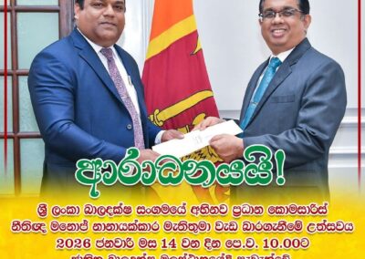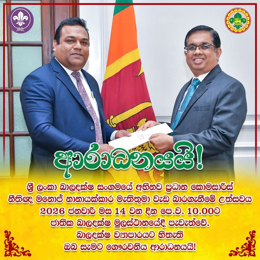 ශ්‍රී ලංකා බාලදක්ෂ සංගමයේ ප්‍රධාන බාලදක්ෂ කොමසාරිස් ලෙස නීතිඥ මනෝජ් නානායක්කාර මහතා ශ්‍රී ලංකා බාලදක්ෂ මූලස්ථානයේ දී අද (14) නිල වශයයන් රාජකාරී කටයුතු ආරම්භ කරන ලදී.